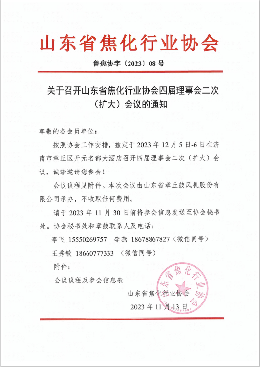 關(guān)于召開山東省焦化行業(yè)協(xié)會四屆理事會二次(擴(kuò)大)會議的通知